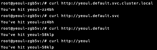 다음과 같이 파드의 환경에 접근해서 환경변수의 목록을 확인해보면 아까 생성한 YEOUL_SERVICE에 대한 정보들이 이미 저장되어 있는 것을 알 수 있습니다 파드는 이 정보를 통해 서비스에 접근하고 요청을 보낼 수 있는 것입니다.