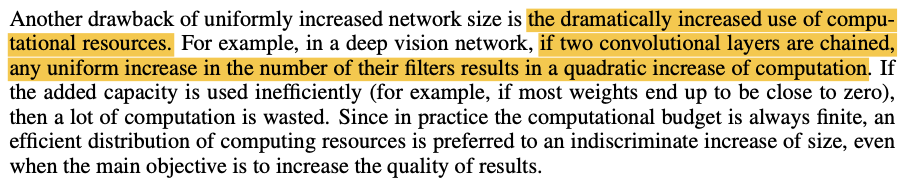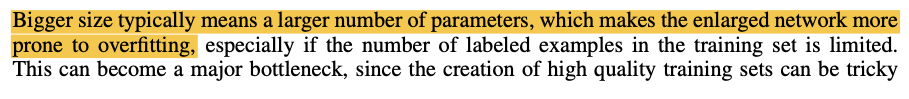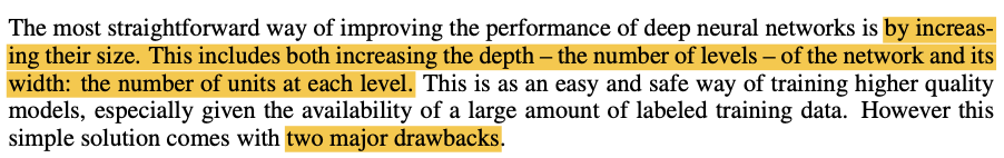 Deep Neural Network의 성능을 향상시키는 가장 명확한 방법은 그 크기 (width, depth)를 증가시키는 것이지만 여기에는 2가지 뚜렷한 단점이 존재한다. 하나는 큰 사이즈의 네트워크는 파라미터 개수의 증가를 의미하며, 이는 네트워크 자체를 Overfitting하도록 만드는 경향이 있다는 것이며, 다른 하나는 이렇게 "dramatically"하게 증가하는 파라미터의 개수는 너무 많은 Computing Power를 소모한다는 것이다.