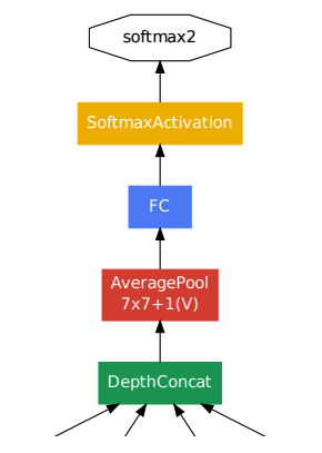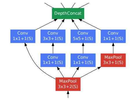 이는 실제로 인셉션 모듈의 개념도와 Filter Concatenation이 어떻게 구현되어 있는지를 보면 조금 더 확실하게 알 수 있는데, 이전 레이어에 1x1, 3x3, 5x5 Convolution 연산을 각각 수행하고, 3x3 max pooling도 수행한 이후에 이를 단순 concat으로 이어준다. 예를 들어서 Previous Layer가 28x28x192, 각각의 Convolution 연산의 결과물이 각각 28x28x64, 28x28x128, 28x28x32, 그리고 3x3 max-pooling의 결과물이 28x28x32라 했을 때 FilterConcatenation이 된 다음 레이어는 28x28x(64+128+32+32) = 28x28x256이 된다는 것이다.