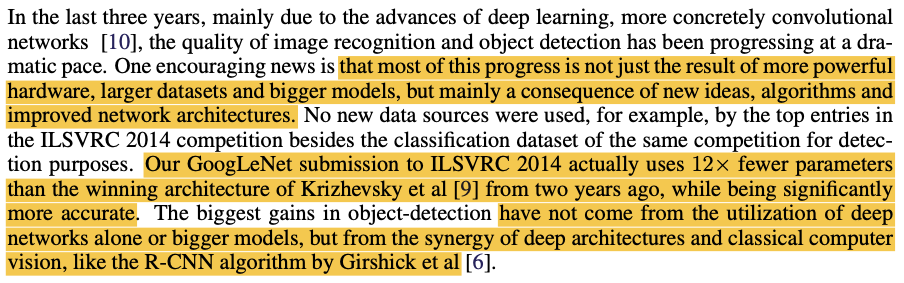 2014년 기준으로 지난 3년동안(2011~2014를 의미하는 것으로 보여진다.) Convolutional Network의 많은 개선이 있었는데 이는 단순히 하드웨어의 개선, 데이터 셋과 더 큰 모델이 아닌 새로운 아이디어, 알고리즘, 그리고 개선되 네트워크 아키텍쳐라고 주장한다. GoogLeNet은 이러한 생각에 기반하여 2년전의 우승 모델(AlextNet)보다 훨씬 더 적은 파라미터(12분의 1(60M -> 5M))를 사용하면서도 더 높은 성능을 보였다고 주장하며, object-detection의 측면에서 Deep Architecture과 Classical한 Computer Vision (R-CNN과 같은) 모델의 시너지를 통해 성능 개선을 이뤄낼 수 있을 것이라고 주장한다.