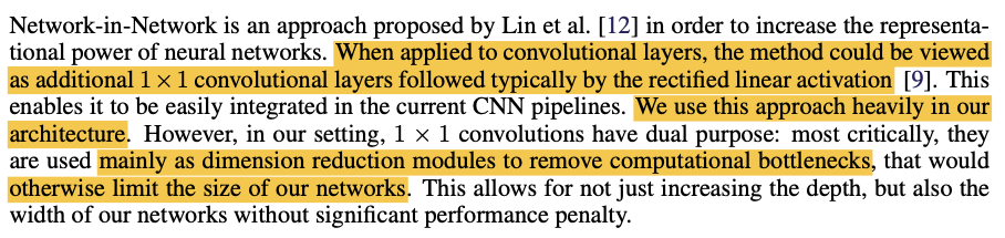 NIN(Network In Network)에 영향을 받은 GoogLeNet은 여기서 영감을 받아 1x1 convolution을 "heavily"하게 사용했다고 주장한다.