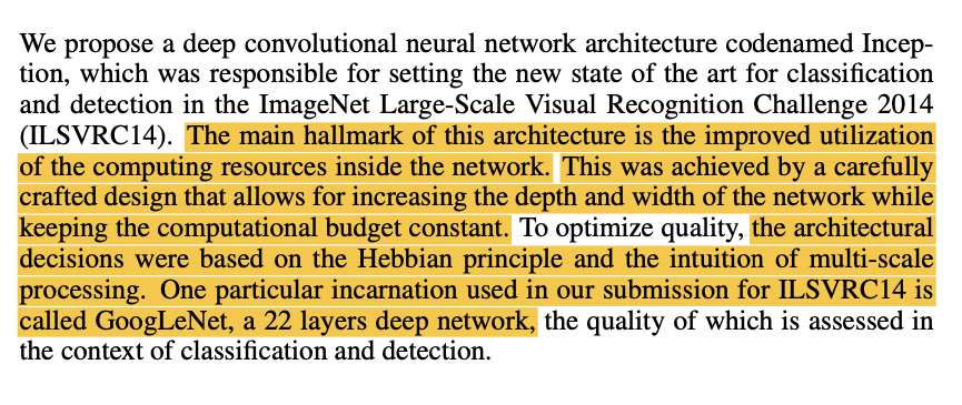 ILSVRC14에서 우승한 모델 GoogLeNet은 네트워크의 "width"와 "height"를 모두 확장하면서도 연산량을 constant하게 유지시킴으로써 연산효율을 높인 모델이라 설명한다. 이를 위해 Hebbian Principle과 Multi-Scale Processing을 적용했다고 한다. GoogLeNet은 총 22개의 레이어로 구성되어 있다. (2014년 논문이라 2015년 논문인 ResNet이 나오기 전이므로 Layer의 개수가 비교적 적다.)