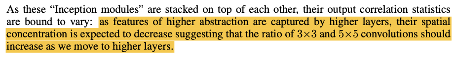 3x3, 5x5 filter는 조금 더 넓은 범위에서의 Correlation(상관관계)를 확인할 수 있기 때문에 조금 더 추상적인 내용을 담고 있는 higher layer에서는 위 두 필터의 사용 빈도가 늘어나게 된다.