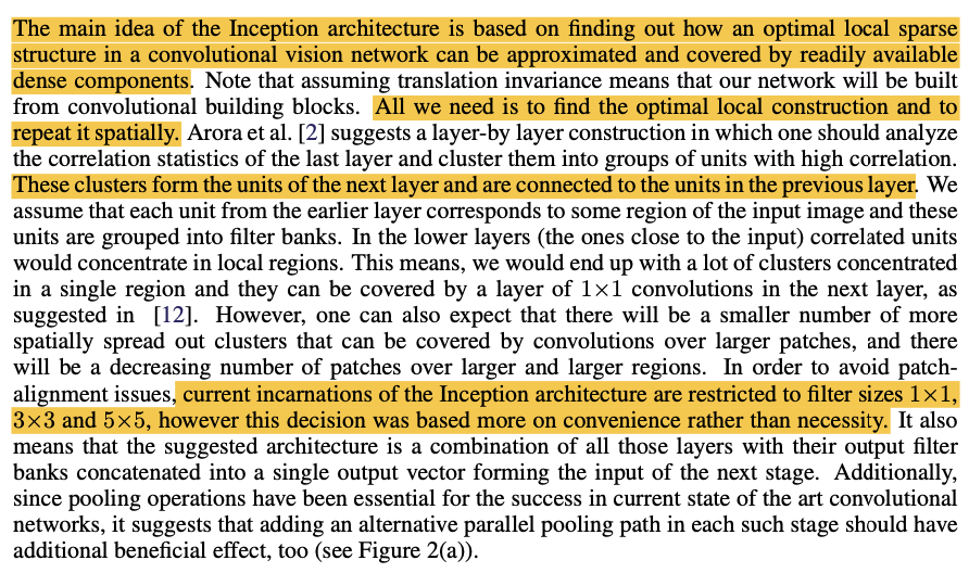 여기서 Sparse하다는 의미는 다음과 같다. 기존 방식(Alexnet)에서는 1x1, 3x3, 5x5 conv연산을 하나의 레이어가 아닌 3개의 레이어로 Fully-connected되어서 처리하기 때문에 "prev - 1x1 - 3x3 - 5x5 - next"와 같은 구조를 띄게 된다. 이렇게 될 경우 컴퓨팅 연산에는 적합하겠지만, 1x1과 3x3은 모두 연결되어 있으므로 sparse하지 않아 위에서 제시한 Overfitting & exploading number of parameter문제를 해결할 수 없다. 하지만 인셉션 모듈에서는 이를 각각 처리하고 prev - 1x1, prev - 3x3... 그냥 concat해주기만 하므로 sparse하면서 dense한 연산방식을 적용할 수 있는 것이다.