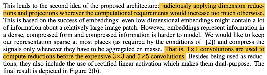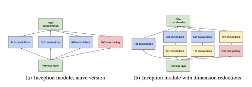 위의 인셉션 모듈(실제로 사용된 것은 1x1 필터가 사용된 b이다)은 1x1 conv연산을 한번씩 적용하고 있는데, 이는 차원 축소의 의도가 크다고 볼 수 있다. 차원을 축소하여 계산해야 할 파라미터를 줄이려는 의도라고 설명하고 있다.