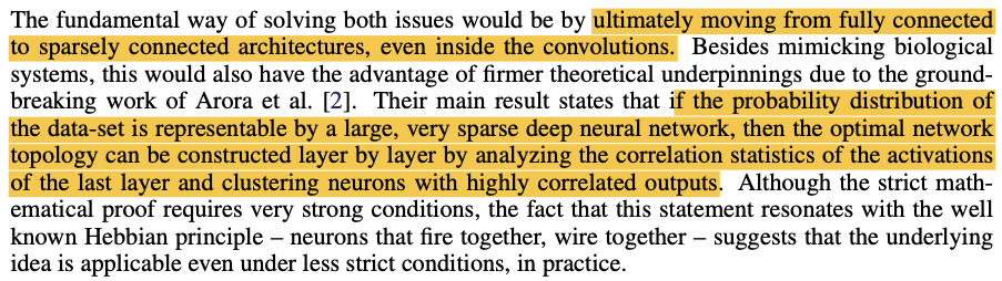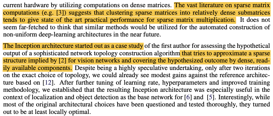 하지만 CPU & GPU가 dense matrix의 병렬연산에 최적화되는 방향으로 진화해온 것과 다르게 sparse matrix의 연산으로는 발전이 더뎠고 이는 오늘날의 컴퓨팅 환경이 sparse data 구조를 다룰 때 비효율적이라는 것을 의미한다. 이 문제를 해결하기 위해 위 논문이 참고한 다수의 문헌에서는 sparse matrix들을 클러스터링해서 상대적으로 dense한 submatrix들로 만들어 연산하면 state-of-the-art performace를 보인다는 것을 주장하고 있고, GoogLeNet은 이러한 형태의 sparse structure를 시험하였으며, 결과적으로 Localization & Object-detection에서 좋은 성능을 보였다고 한다.