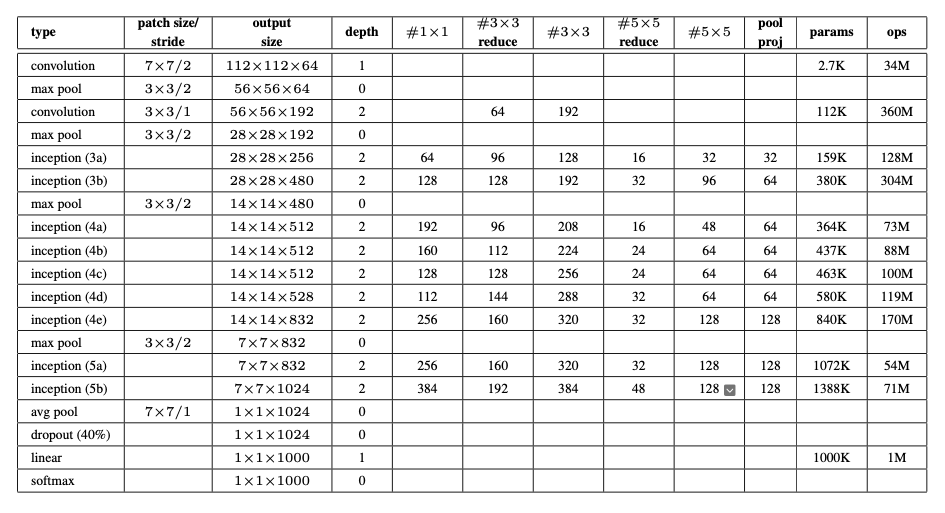 GoogLeNet의 실제 구조는 다음과 같이 22개의 레이어로 구성되어 있으며 실제 레이어를 구성하는 파라미터들은 다음과 같다. 주목할만한 점은 #3x3, #5x5 레이어가 higher level layer로 갈수록 개수가 점점 증가한다는 점이다. 이는 앞서 살펴보았듯, 더 높은 레벨의 레이어에서는 더 추상적인 Feature들이 검출되기 때문에 이를 잘 잡아내기 위해 넓은 범위의 필터를 사용하는 것이다.