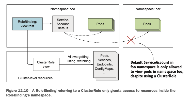 ClusterRole이 항상 ClusterRoleBindings와 연결되어야 하는 것 은 아닙니다. ClusterRole은 Rolebindings에 연결될 수도 있고, ClusterRoleBindings에 연결될 수도 있습니다. RoleBindings에 연결되는 경우 RoleBindings는 namespace가 있으므로 해당 namespace안에 있는 리소스에 대해 권한이 부여됩니다. Role을 여러 namespace에서 재사용하고 싶을 때 ClusterRole 을 생성한 뒤에 RoleBindings로 묶어서 재사용하는 방법을 사용하기도 합니다.