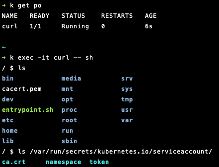 실제로 Secret과 ConfigMap을 다룬 이전 포스팅에서 살펴보았듯, 기본적으로 쿠버네티스가 가지고 있는 secret은 파드가 생성될 때 마운트 되며, 이 secret은 container의 fileSystem에 마운트 되어 컨테이너 내에서 접근 가능하게 됩니다. 위에서 볼 수 있듯, ca.crt, namespace, token이 들어있게 되며 여기 있는 토큰을 사용해서 API 서버와의 통신이 가능하게 됩니다. 실제로 API 서버에 요청을 보낼 때 API 서버의 인증 플러그인(authentication)은 이 토큰을 사용해서 해당 Service Account를 인증하고 API 서버에게 ServiceAccount username을 알려줍니다. 이후에 권한 부여 플러그인(authorization)으로 넘겨서 실제로 해당 유저가 해당 요청을 보낼 자격이 있는지를 검증하게 됩니다.