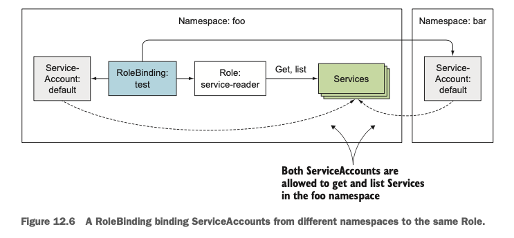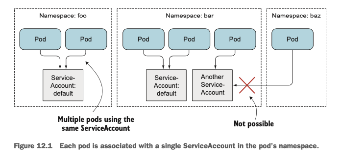 각 파드는 오직 하나의 ServiceAccount와 연결될 수 있지만, 같은 ServiceAccount를 여러 개의 파드에서 재사용할 수 있습니다. 단 ServiceAccount는 namespace단위의 리소스이므로 다른 namespace에 있는 ServiceAccount를 사용해서 인증을 할 수는 없습니다.