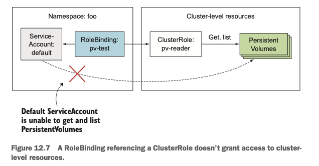 위와 같이 연결하게 되면 foo namespace안의 ServiceAccount를 사용하는 Pod들이 클러스터 레벨의 리소스인 PersistentVolumes에 접근할 수 있게 됩니다.