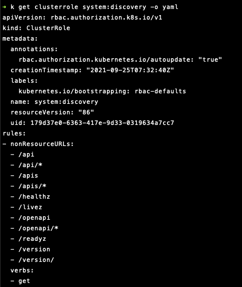 kubectl get clusterrole system:discovery -o yaml