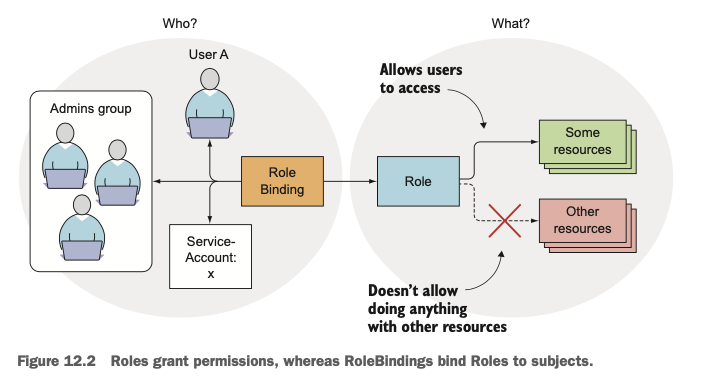 - RoleBindings, ClusterRoleBindings: "Who"에 해당하며, 위 Role을 적용할 user, group, serviceAccounts를 관리합니다.