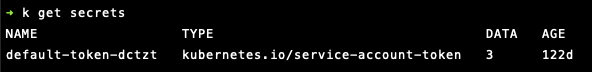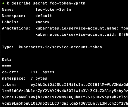 - ServiceAccount 생성시에 custom token Secret이 생성되게 되며 kubectl describe secret <token-name> 명령어를 사용해서 해당 시크릿의 정보를 확인할 수 있습니다. 위에서 확인했던 것처럼 ca.crt, namespace, token 정보다 포함되어 있음을 알 수 있습니다.