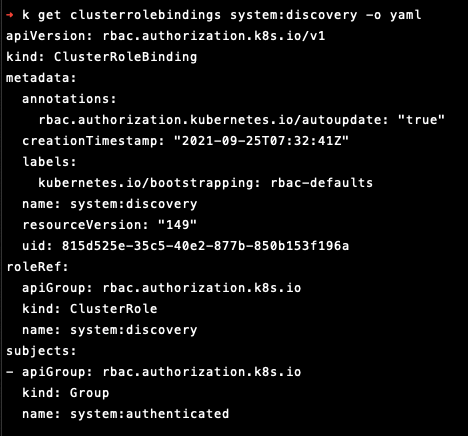 kubectl get clusterrolebinding system:discovery -o yaml