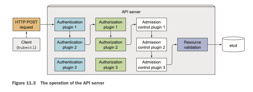 API 서버는 REST Interface를 노출하기 때문에 사용자는 HTTP 요청을 서버로 보내게 됩니다. ServiceAccount를 통해 사용자를 인증하며, 인증된 사용자가 해당 요청을 수행할 권한이 있는지를 Authorization Plugin을 통해 판단하게 됩니다.