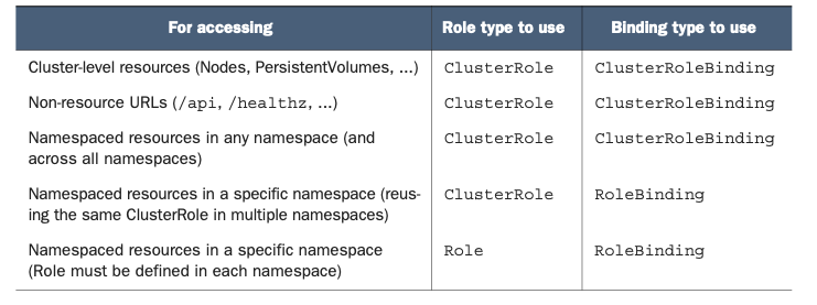 앞에 "Cluster"가 붙은 리소스는 namespace가 아닌 Cluster 레벨의 리소스를 관리한다는 의미이며 그렇지 않은 경우는 특정 namespace의 리소스를 관리한다는 의미입니다.