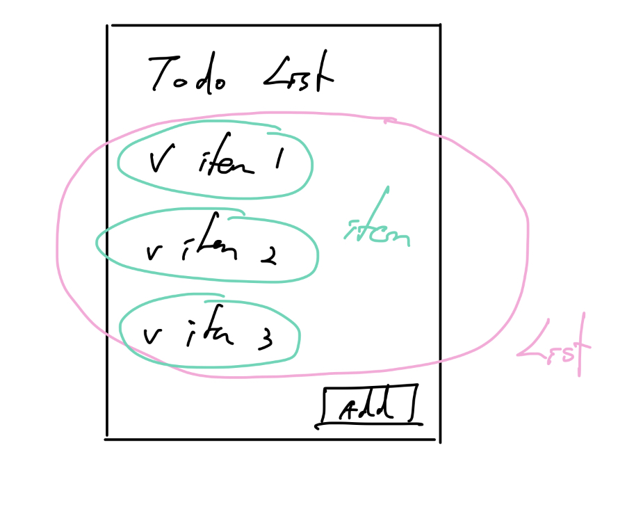어려움을 주는 두 번째 요인은 대부분의 경우 "테스트 코드를 작성하는데 너무 많은 비용이 든다"는 것입니다. 아주 간단한 예제인 Todo List 애플리케이션에 테스트 코드를 작성하는 것을 예로 들어보겠습니다. 리스트의 목록은 전역 스토어(여기서는 Redux라고 하겠습니다)를 사용한다고 가정하고, 컴포넌트 구조는 다음과 같이 List 컴포넌트 안에 Item 컴포넌트 여러 개가 위치하도록 잡는다고 하겠습니다.