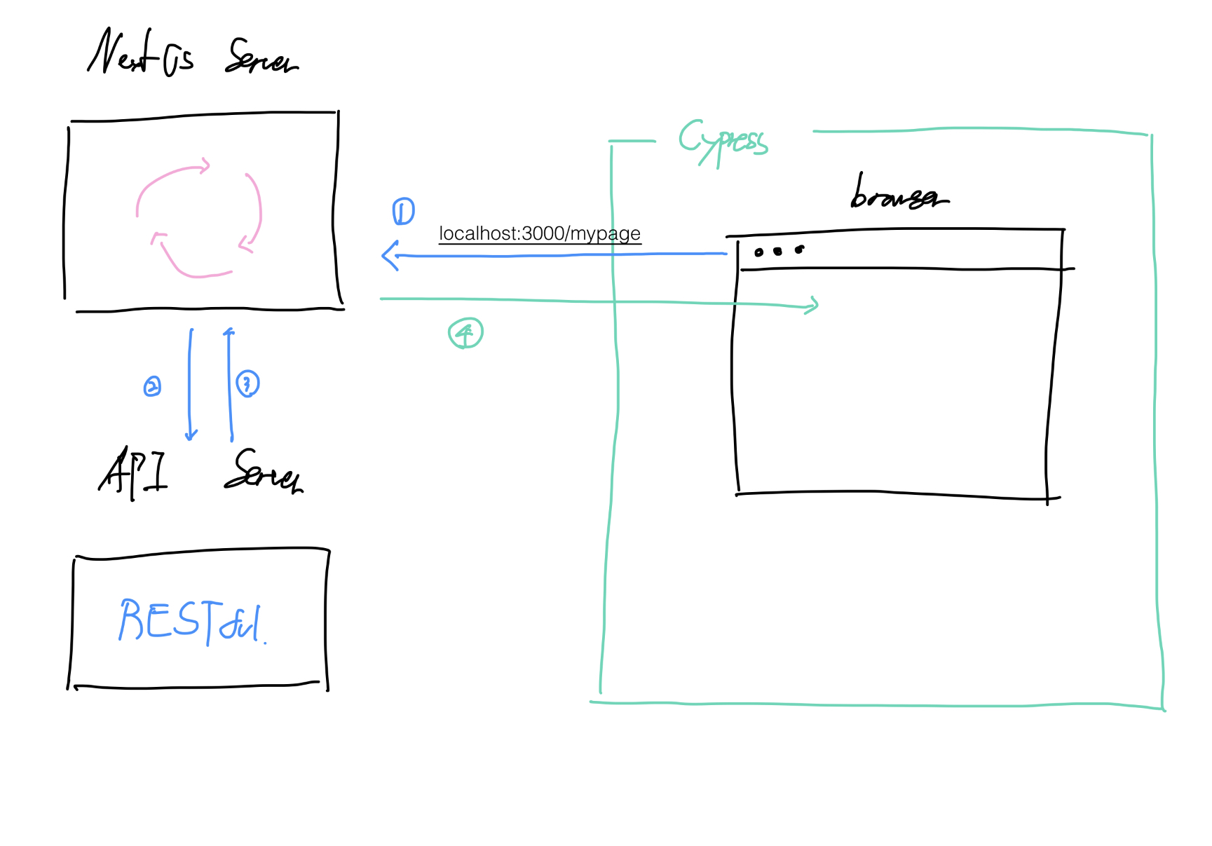 Cypress는 브라우저에서 할 수 있는 모든 것들을 테스트할 수 있습니다. 하지만 Nextjs와 같이 서버사이드 렌더링을 사용하는 프로젝트의 경우 난관이 존재합니다. "브라우저에서 할 수 없는 것"들도 존재하기 때문입니다. 실제로 Nextjs서버에 페이지 생성을 요청했을 때, Nextjs가 HTML을 그리기 위해 Server Side에서 Internal Request를 통해 Customized 된 데이터를 받아오고 이를 통해 뷰를 그리는 경우를 생각해 보겠습니다.