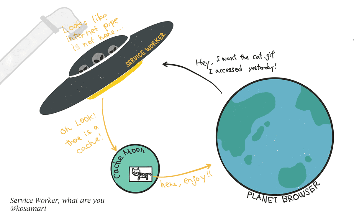 - 서비스 워커는 프로그래밍 가능한 네트워크 프록시이며, 페이지의 네트워크 요청 처리 방법을 제어할 수 있습니다. 서비스 워커는 사용하지 않을 때는 종료되고 다음에 필요할 때 다시 시작되므로 서비스 워커의 onfetch 및 onmessage 핸들러의 전역 상태에 의존할 수 없습니다. 보관했다가 다시 시작할 때 재사용해야 하는 정보가 있는 경우 서비스 워커가 IndexedDB API에 대한 액세스 권한을 가집니다.