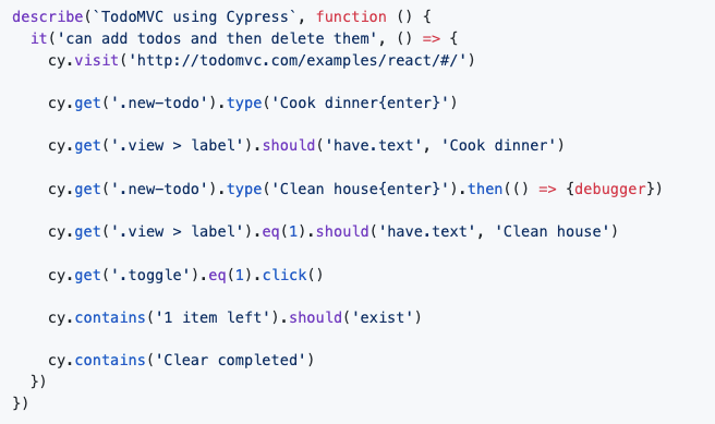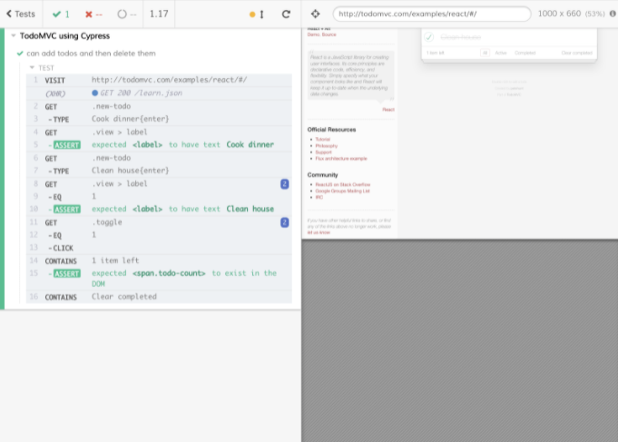실제로 공식 문서에서 누구나 쉽게 설치하고 테스트 코드를 작성할 수 있도록 많은 예제들과 튜토리얼들을 제공하고 있으며, 플러그인들도 쉽게 확인하고 사용할 수 있도록 안내하고 있습니다. 실제로 Cypress에서 동작하는 테스트 코드는 아래와 같은 형식을 가지고 있으며 실제로 테스트 코드를 실행하면 아래와 같이 실제 브라우저 환경에서 테스트 코드가 동작하면서 시각적으로 피드백을 남겨주는 것을 확인할 수 있습니다. CI 환경에서 테스트 코드를 동작시킬 때는 headless 모드로 GUI 없이 동작시킬 수 있으므로 시각적 피드백 없이 빠르게 동작시킬 수도 있습니다. (물론 여전히 브라우저 환경이므로 테스트 실패시에 스냅샷을 남겨주는 기능도 내장하고 있습니다.)