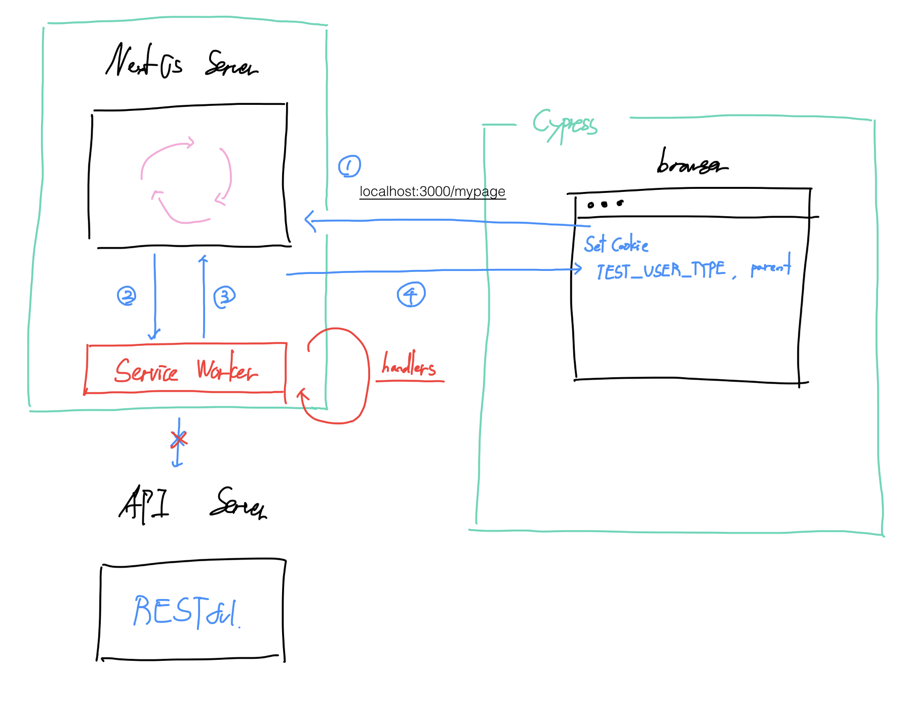 즉 서비스 워커는 네트워크 프락시로 사용할 수 있으며, 이를 사용하면 서버사이드에서 일어나는 네트워크 요청을 가로채서 원하는 값을 주는, 즉 "모킹(Mocking)"의 기능을 하는 주체로써 사용할 수 있다는 것입니다. 이를 사용하면 다음과 같은 일련의 과정을 통해 서버사이드에서 발생하는 네트워크 요청들을 Cypress 테스트 환경에서 모킹 할 수 있습니다.