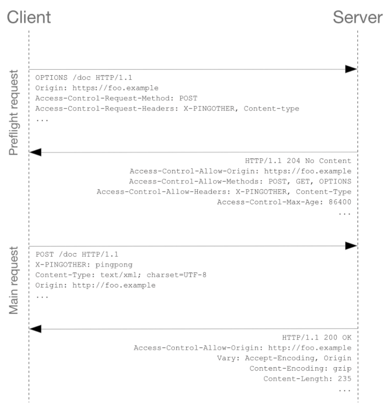 Cross Origin 요청을 보낼 때 다음과 같이 브라우저가 Preflight 요청을 보내는 경우가 있습니다. 이는 본격적인 Cross Origin HTTP 요청 전에 서버에서 해당 요청의 메서드와 헤더에 대해 인식하고 있는지를 체크하는 것을 의미합니다.