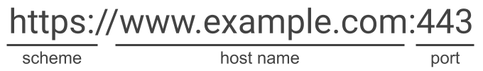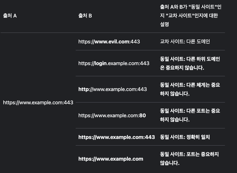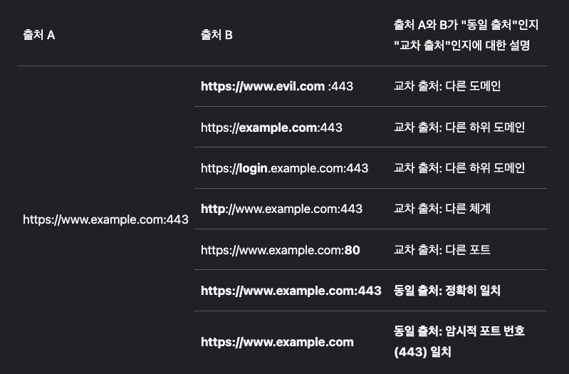 Origin(출처)는 프로토콜(체계) + 호스트이름 + 포트의 조합을 의미합니다. 기본적으로 포트가 명시되어 있지 않으면 암시적으로 해당 프로토콜(scheme)이 갖는 포트(https: 443, http: 80)로 취급합니다. 따라서 포트나 프로토콜이나 호스트중 하나라도 다르면 두 사이트는 Cross-Origin이 됩니다.