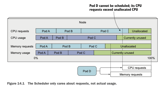스케줄러는 파드를 띄울 노드를 선택할 때 스케줄링 당시에 소비되고 있는 자원들의 총량이 아닌 해당 노드에 존재하는 파드의 requests를 확인한 후, 이들의 총합을 기준으로 선택합니다. 스케줄링 당시에 자원을 적게 소모한다고 해서 스케줄러가 해당 노드에 추가로 스케줄링을 해버리면 나중에 해당 노드에 있는 파드의 컨테이너가 request만큼의 자원을 사용하려 했을 때 자원이 부족해지는 현상이 나타날 수 있기 때문입니다. 따라서 항상 request를 기준으로 스케줄링을 진행하게 됩니다.