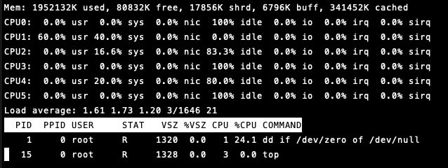 여기서의 CPU 사용률은 11.7%의 가용률을 보이는데, 이는 실행환경의 CPU 코어가 6개라서 그런 것이고, 실제로 해당 화면에서 키보드의 "1"을 입력하고 나면 하나의 CPU에서 100% 정도의 가용율(usr 60%, sys 40%)을 사용하고 있음을 확인할 수 있습니다. 즉, request의 CPU 설정은 최소 조건을 의미하므로 여유분이 있을 경우, 컨테이너는 제한 없이 원하는 만큼 자원을 사용할 수 있게 됩니다. 제한을 줄 수 있는 방법도 있는데 이는 아래에서 설명할 Limit을 통해 가능합니다.