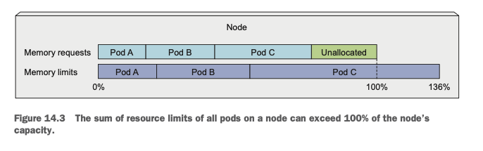이러한 특성 때문에 메모리의 경우 limit을 적절하게 설정하여 하나의 파드가 메모리를 지나치게 사용해서 다른 파드들의 실행해 영향을 주지 않도록 주의해야 합니다. 앞서 이야기한 것처럼, 스케줄러는 스케줄 시점의 자원이 아닌 requests를 보고 남은 자원을 판단하기 때문에 메모리가 실제 사용량보다 많은 경우 스케줄링이 되어도 실제로는 메모리 부족으로 실행되지 않을 수 있습니다.