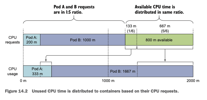 별도의 limit을 설정하지 않는다면 파드 내의 컨테이너들을 request이상으로 해당 노드의 리소스를 사용할 수 있습니다. 만약 하나의 노드에 여러 개의 파드들이 스케줄 되어 있고, 각각의 파드들이 별도의 limit이 없이 request만 가지고 있다면 잔여 리소스들은 여러 개의 파드들의 request의 비율에 맞게 분배됩니다. 예를 들어 아래의 예제와 같이 2개의 파드가 각각 200m, 1000m의 CPU를 요청했다면 남은 CPU time(800m)은 각각 1:5의 비율로 비례 배분되어 추가적으로 사용할 수 있게 됩니다.