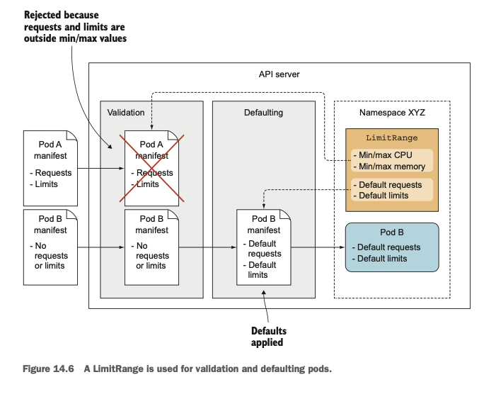 위에서 살펴본 것처럼 requests/limits를 명시적으로 설정하는 것이 좋습니다. 하지만 매 파드마다 이를 설정하는 것은 번거로운 작업이므로 쿠버네티스에서는 이러한 requests/limits를 Namespace 단위로 설정할 수 있는 기능인 LimitRange 리소스를 제공합니다. LimitRange를 설정하면 해당 네임스페이스에 속한 파드들에 기본적으로 minimum & maximum limit이 설정되며 기본적으로 request 값을 설정하지 않은 파드에게도 기본적으로 request를 설정해줍니다.