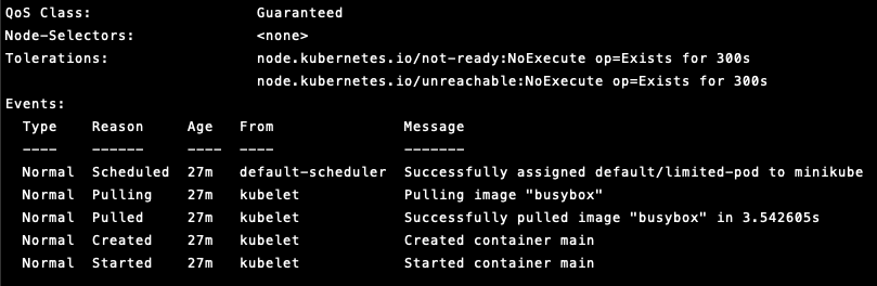 QoS 클래스는 따로 설정하는 것은 아니며, 파드의 requests/limits 값으로부터 자동으로 도출됩니다. 도출된 QoS 클래스는 파드의 정의에 포함되며 kubectl describe pod 명령어를 통해 어떤 QoS 클래스가 도출되었는지를 확인할 수 있습니다.