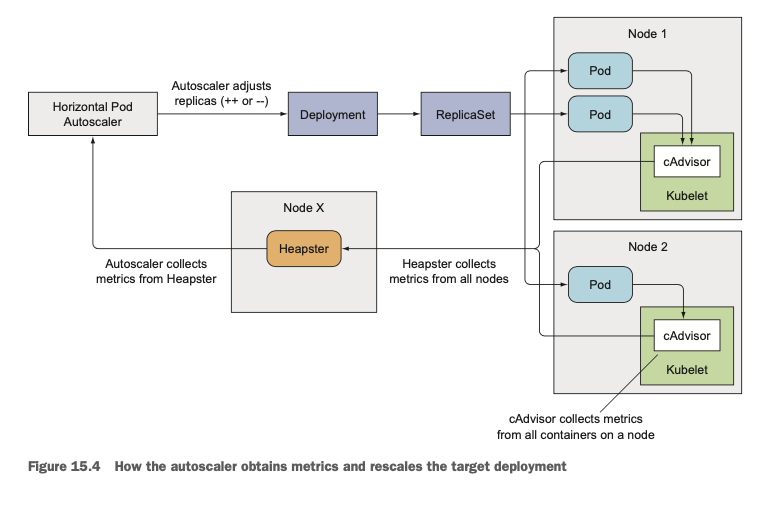 Autoscaler(HPA)가 스케일링을 위한 계산을 수행하고 실제 리소스의 replica를 수정하긴 하지만(API Call), HPA자체가 지표를 주기적으로 수집하는 것은 아닙니다. 파드와 노드에 관련된 지표들(metrics)은 각 노드의 kublet에서 동작하는 cAdvisor라는 Agent에서 수집되며, 이 지표들은 잘 수합되어 Heapster(metrics-server)로 전송됩니다. HPA는 이 metrics server에 주기적으로 쿼리를 요청해서 계산에 필요한 정보를 가져오게 되는 것입니다.