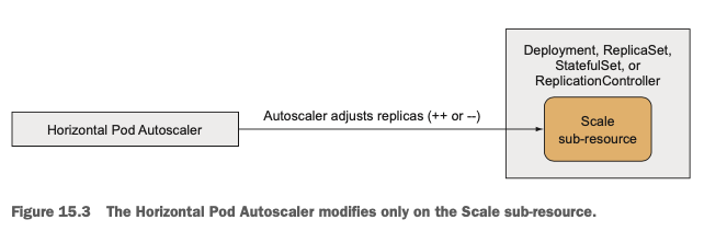 실제로 HPA가 Scaled Resource Object(ReaplicaSet, Deployments, ReplicationControllers, StatefulSets)의 replicas를 업데이트하는 데 있어서 해당 오브젝트의 구체적인 스펙을 알지 못해도 되도록, HPA와 Scaled Resource Object 사이에는 "Scale"이라는 SubResource를 두어 추상화합니다. 실제로 HPA는 위에서 설명한 계산 메커니즘을 토대로 Scale의 Replica Count만 조절하고 Scale 리소스는 내부의 Object의 Replicas field를 업데이트합니다.