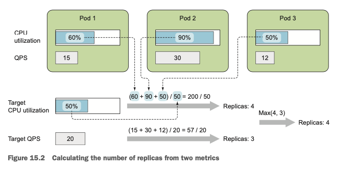 계산에 필요한 지표가 2개 이상일 경우에는 각 metric 별로 요구하는 파드의 개수 중 최댓값을 택합니다. 아래의 예시에서 CPU metric을 사용한 경우의 파드의 개수는 4개이고 QPS(Query Per Second) metric을 사용한 경우 파드의 개수는 (15 + 30 + 12) / 20 = 57 / 20 = 2.85 = 3 이므로 max(4, 3)은 4개가 되어 4개로 스케일링하게 됩니다.