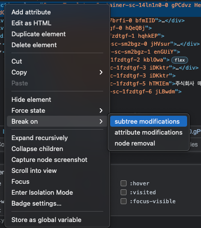 아래와 같은 기준으로 DOM의 변화에 Breakpoint를 걸 수 있습니다. DOM 이외에도 Exception, Event Listener, XHR / Fetch breakpoints 등을 걸 수 있는 기능을 제공합니다.