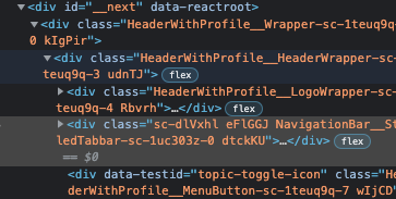 Element Tab에서 Flexbox가 적용된 DOM Node들은 이렇게 옆에 flex 태그가 붙어있는 것을 확인할 수 있습니다. 이 태그는 "Toggle"의 기능도 수행하는데, 실제로 Clickable한 "버튼"임을 확인할 수 있습니다. 해당 Toggle을 클릭하면 아래와 같이 Flexbox가 차지하는 영역을 확인할 수 있습니다.