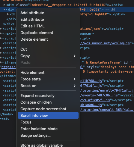 Chrome DevTools의 Element 탭에서 특정 Element에 대고 마우스 우클릭을 하면 여러 옵션들이 있는 것을 확인할 수 있습니다. 아래는 DOM을 쉽게 조작하고 디버깅할 수 있는 여러 옵션들에 대해 소개합니다.