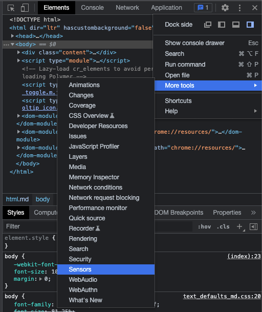 DevTools 설정에서 More tools > Sensors를 클릭하면 실제로 브라우저의 Geolocation 정보를 수정할 수 있습니다. 이를 수정하면 실제로 브라우저가 보내는 Request의 accept-language 헤더가 설정한 로케일의 정보로 넘어가게 되며 이에 따라 특정 로케일에서의 애플리케이션의 동작 등을 유용하게 테스트할 수 있습니다.