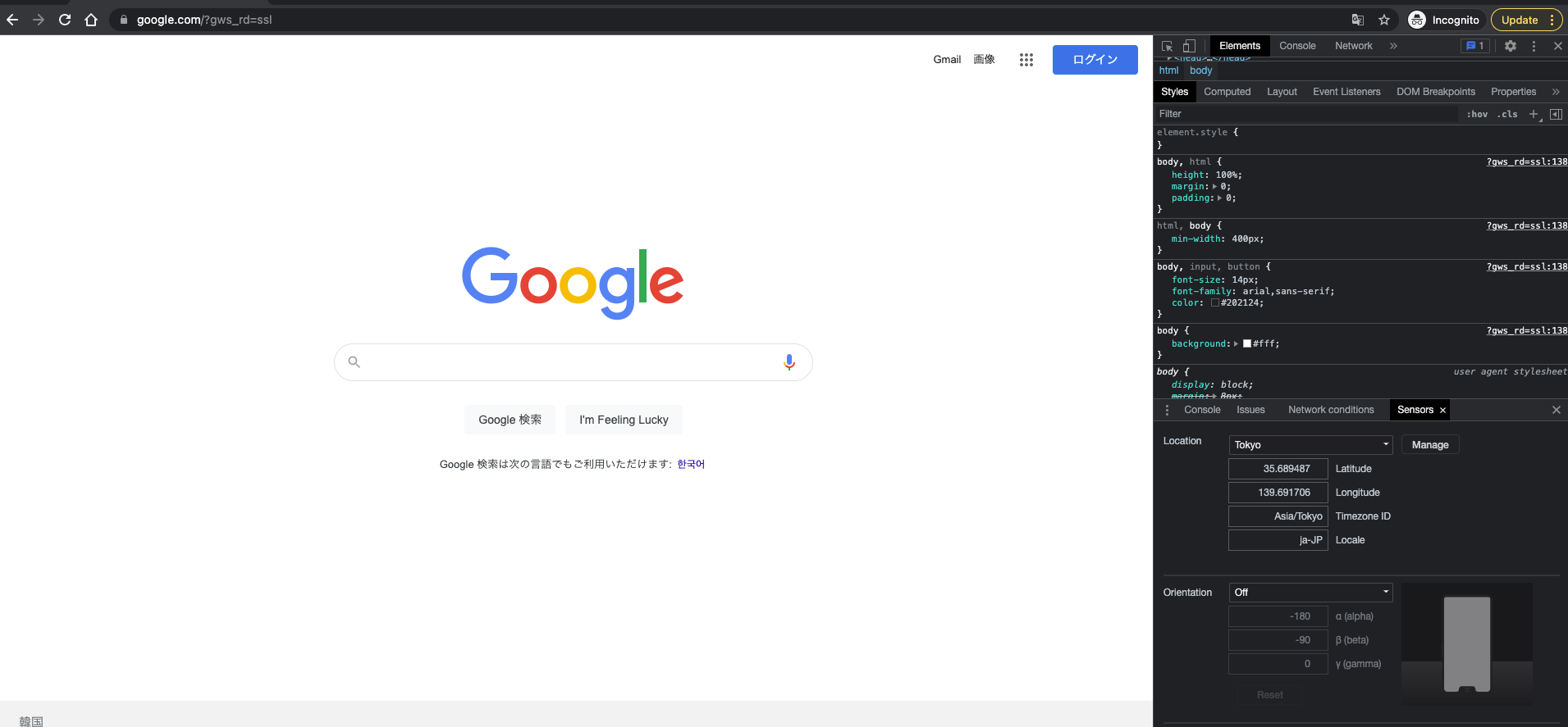 아래 예시는 시크릿 탭(Incognito Mode)에서 Geolocation정보를 Tokyo로 설정한 후에 google.com에 페이지 요청을 보낸 예시입니다. 실제로 일본어로 번역된 구글 검색 페이지가 Response로 넘어오는 것을 확인할 수 있습니다.