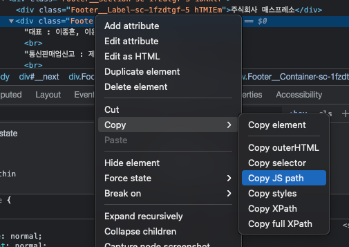 - JS Path 이외에 Copy Styles기능도 제공하는데 실제로 해당 Element에 적용된 스타일들을 구성해주며, CSS를 디버깅하거나 다른 웹사이트의 CSS 구성을 참고하는데 도움을 줄 수 있는 옵션입니다.