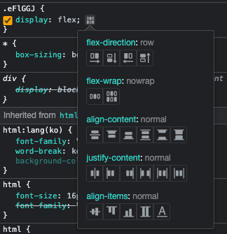 또한 Elements 탭을 열면 아래에 같이 열리는 Styles 탭에서 display: flex 속성이 적용된 스타일 옆에는 6개의 직사각형이 그려진 버튼이 있는데, 이를 클릭하면 버튼의 형식으로 구체적인 flex 속성들을 별도의 타이핑 없이 빠르게 적용해보고 실험해볼 수 있습니다.