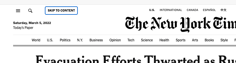 일반적인 웹사이트는 상단 내비게이션(헤더)에 여러 메뉴를 포함하며, 해당 사이트 내에서 페이지를 이동할 경우 이러한 요소들은 반복됩니다. 마우스 클릭이 아닌 스크린 리더를 통해 페이지의 요소를 접근하는 사용자의 경우에는 페이지 이동 시마다 상단의 모든 메뉴를 반복해서 "Tab"하는 것이 불편할 수 있습니다. 따라서 이러한 경우에 첫 번째 탭을 눌렀을 때 바로 메인으로 이동하도록 처리할 수 있습니다. Github이나 New York Times와 같은 사이트에는 이러한 기능을 제공하며, 스크린 리더 사용자들이 불필요하게 페이지 방문시마다 헤더의 모든 탭을 누를 필요가 없도록 지원합니다.