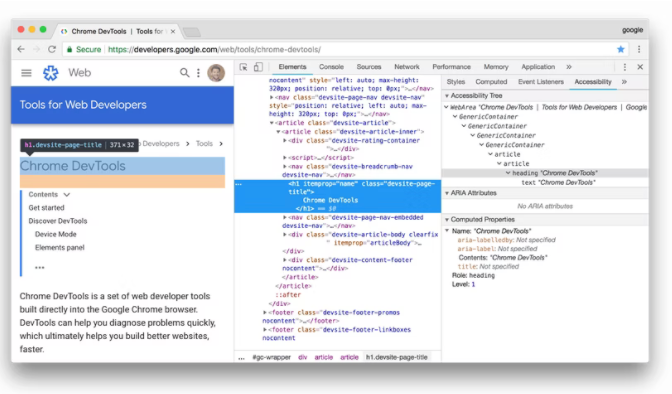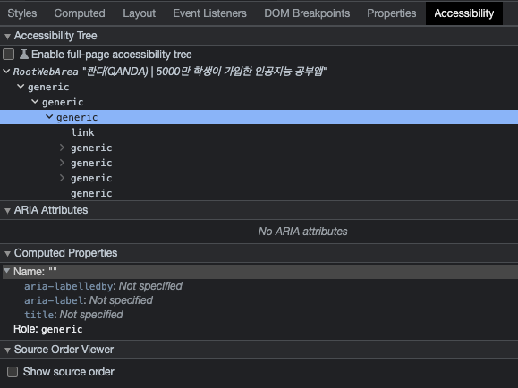 Chrome 브라우저를 사용하는 경우 "Accessibility" Tab을 잘 사용하면 해당 웹 페이지가 스크린 리더 등의 보조 기술로 보여졌을 때 어떤 접근성 트리를 구성하는지를 쉽게 파악할 수 있습니다.