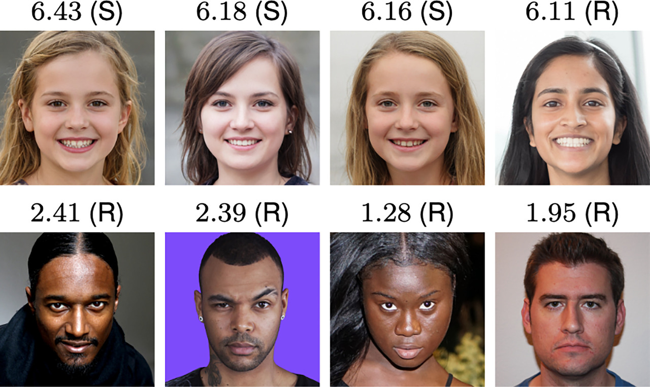 We selected 400 faces synthesized using the state-of-the-art StyleGAN2, ensuring diversity across gender (200 women; 200 men), estimated age (ensuring a range of ages from children to older adults), and race (100 African American or Black, 100 Caucasian, 100 East Asian, and 100 South Asian).