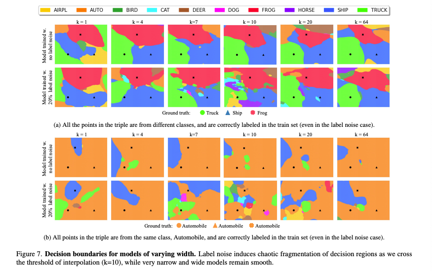 실제로 학습을 시켜보면 Noisy Label이 포함된 경우 width Parameter K가 interpolation threshold에 가까워질수록 decision boundary가 점점 더 fragmented되는 현상을 확인할 수 있으며, 해당 threshold을 넘어서게 되면, 실제로 성능이 좋아지는 것을 확인할 수 있다. 즉 모델 학습에 있어서 noisy label이 들어가게 되면 Double Descent 현상을 일으키게 되며, 모델의 불안정성(instability)을 높인다는 것이다.