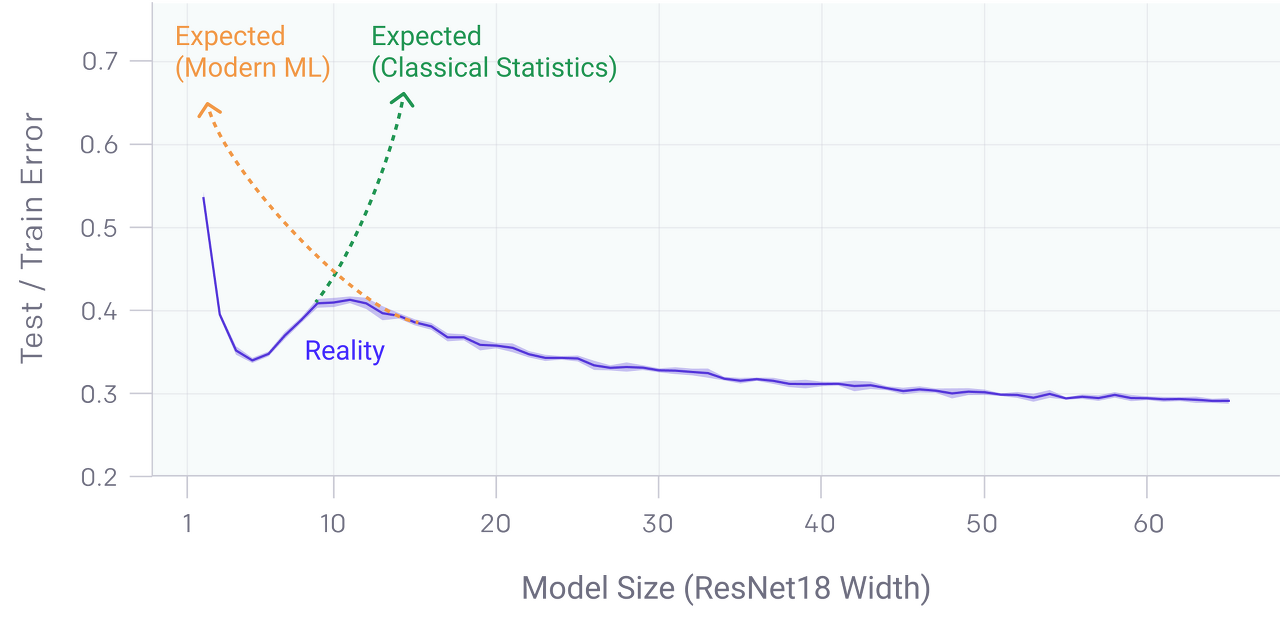 CNN, ResNet등의 모델의 Training 과정에서 나타나는 현상으로 퍼포먼스가 초기에는 증가하다가 모델 사이즈가 증가하면서(여기서 모델 사이즈란, 레이어의 갯수를 의미함) 퍼포먼스가 급격하게 떨어지고, 그러다가 어느 임계점을 지나면서 퍼포먼스가 급격하게 좋아지는 현상을 의미한다.