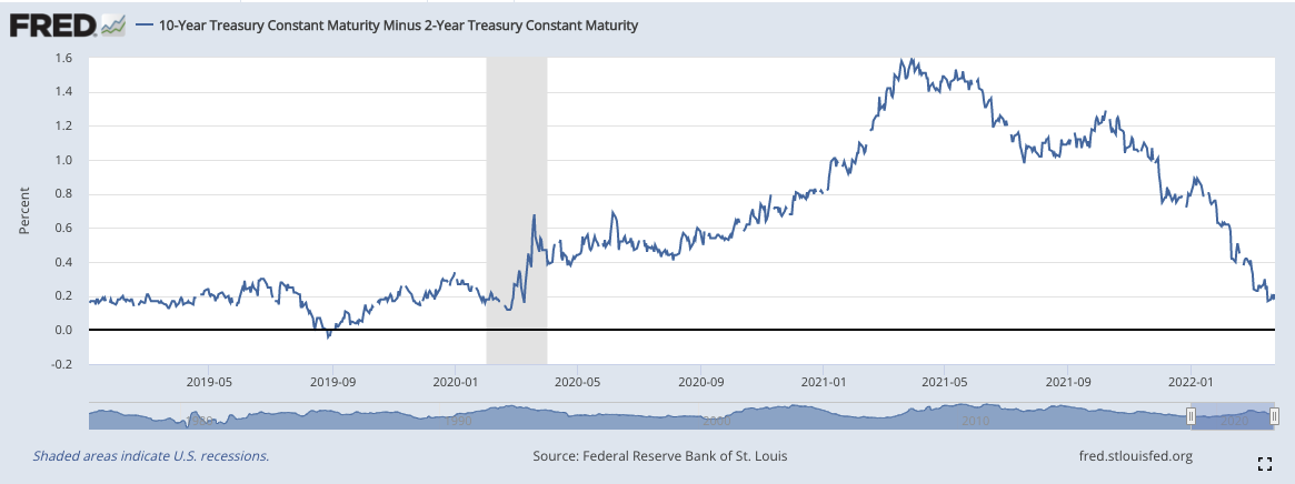 FOMC회의에서 미 연준이 3월 0.25%의 금리 인상을 선언하면서 2018년부터 이어져왔던 양적완화의 시대가 종료되었다. 이후 남은 6차례의 FOMC(5, 6, 7, 9, 10, 12월)에서 모두 금리를 인상할 것이라고 이야기했고 연내 2 ~ 2.25%, 2023년까지 2.75% 정도의 금리인상을 예고하면서 올해 한두 번은 0.5%를 인상하는 'Big Shot'이 있을 것임을 예고했다. 이에 따라 미국의 단기, 장기 국채금리 모두 상승하면서 현재 2년 국채금리가 2.16%, 10년 국채 금리가 2.38%에 도달했다. 주목할 만한 점은 연준의 금리 인상에 더 큰 영향을 받는 단기 금리가 더 빠르게 올라가면서 장단기 금리차가 계속해서 축소되는 모습을 보여주고 있다는 것이다.